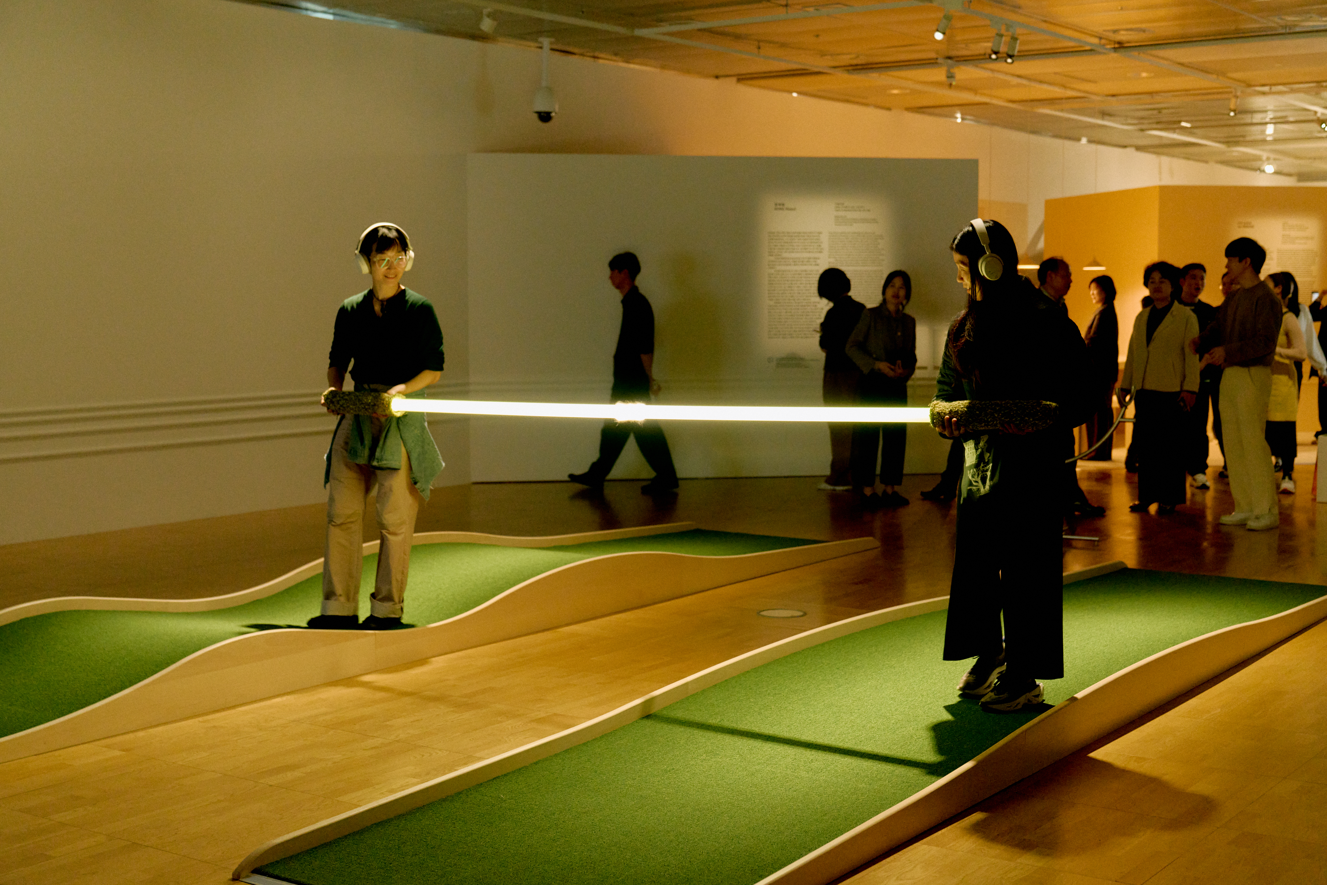 Two long, wave-like platforms with different slopes sit side by side in a dim space. Each participant stands on their respective platform, holding a single pole that connects them to the person standing on the other platform. In response to the tilt of the illuminating pole and the two people's movements, a marble of light inside moves in sync with two voices trying to achieve harmony. When perfectly balanced, the whole pole lights up and the sound reaches harmony, which encourages synchronized movements. It is a moment of mutual extension—where my body reaches toward you, and yours toward me—through sensation and energy.