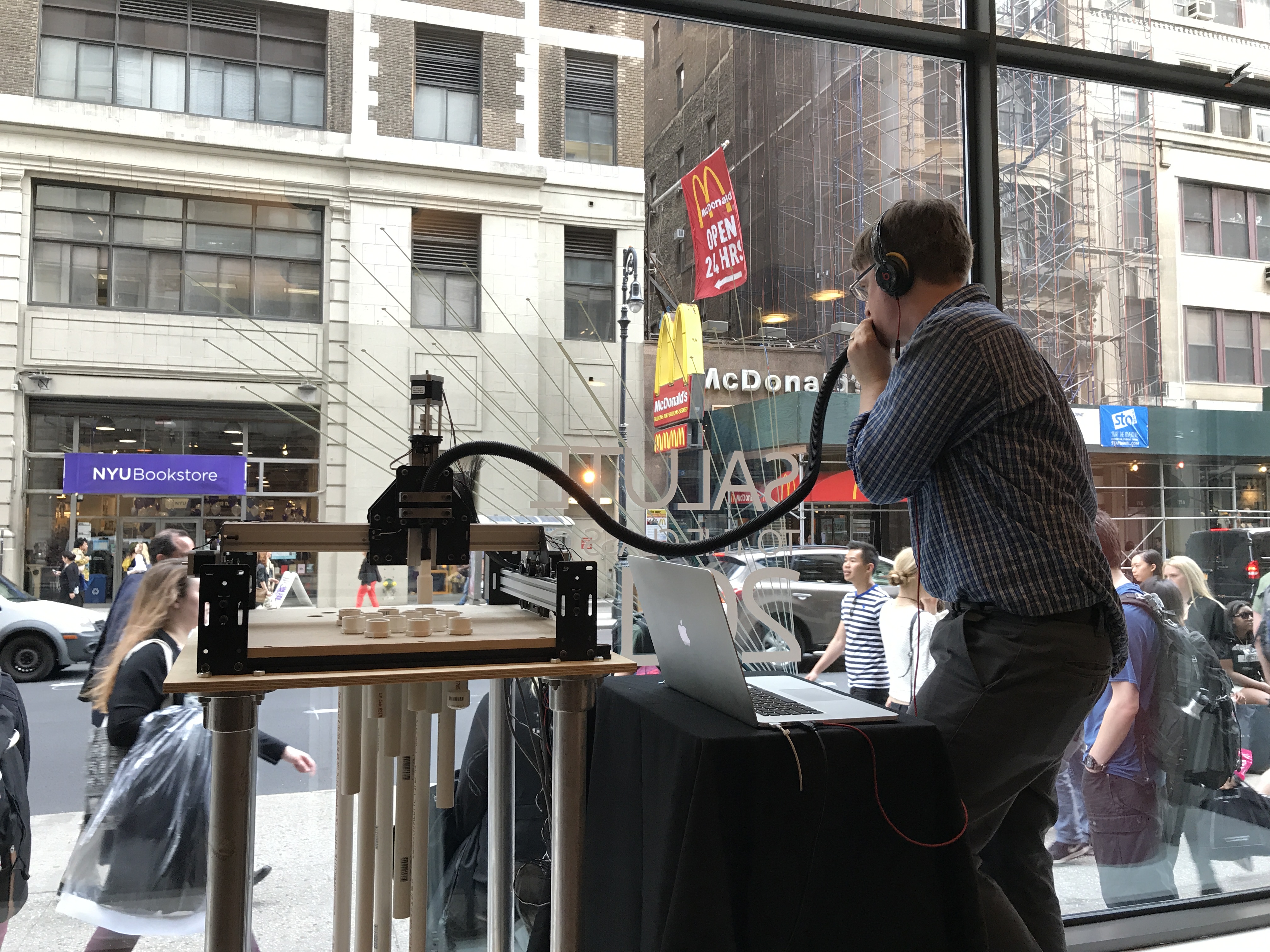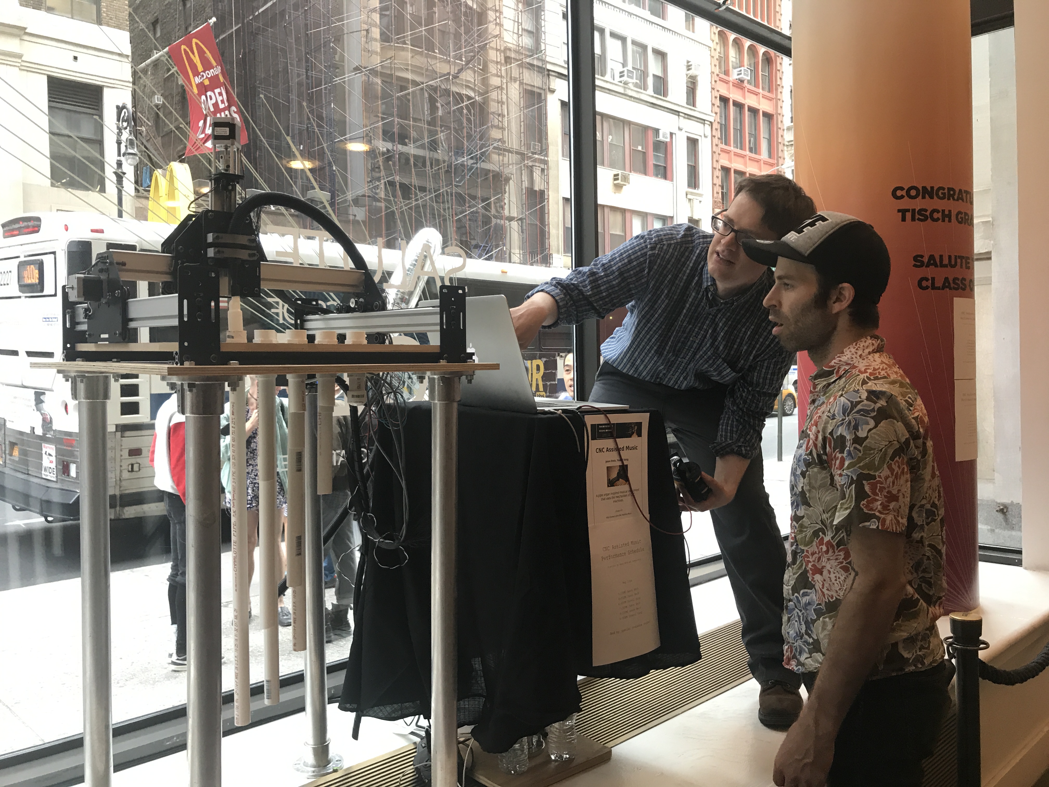 CNC Music Factory is a pipe organ inspired musical instrument that uses the mechanism of CNC machines. The bot is made to play a music in collaboration with a person. A performer plays different tunes by controlling the position of the nozzle using a web app that send gcode to the machine.